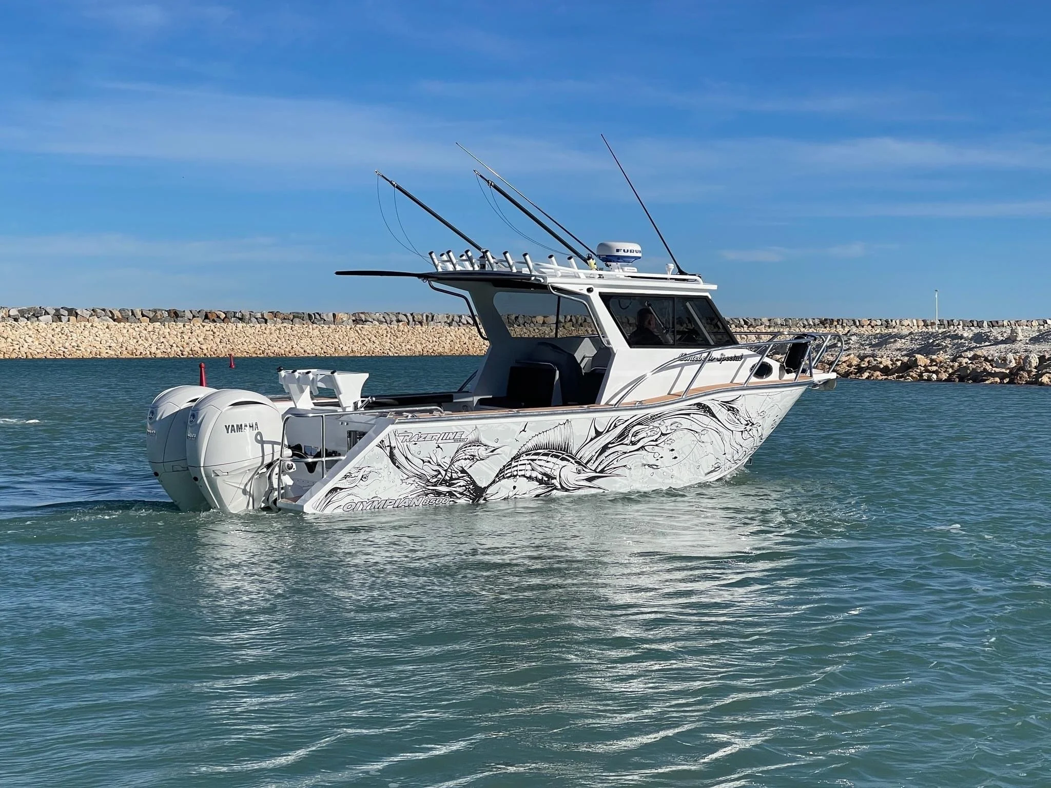 Pictured to the right is a Razerline Olympian 7.6m (8500) Montebello Special vessel with custom paint work. Most often our clients chose to paint the superstructure White N14, with an optional inlay of colour on the side sheets. However, the owner of this featured vessel opted for a unique paint job. The superstructure has been painted Black N61 from the windows up, and Basalt N54 throughout the rest of the boat, with the addition of a detailed Spanish Mackerel graphic wrap.